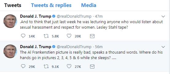 Trump and his ilk have vigorously denied the allegations, with press secretary Sarah Huckabee Sanders recently declaring from the podium that all of the president’s accusers are liars. But they’ve resurfaced in the wake of the Roy Moore scandal, which has left both Trump and the Republican Party metaphorically handcuffed to a Senate candidate accused of child molestation. Neither measure of hypocrisy seems to weigh on Trump, however, who gleefully ripped Franken Thursday night on Twitter.