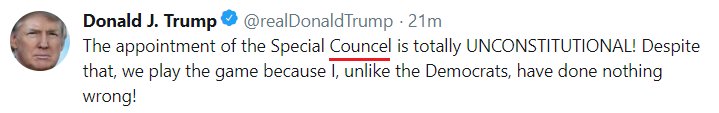 From the Office of Legal Counsel:As has been stated by numerous legal scholars, I have the absolute right to PARDON myself, but why would I do that when I have done nothing wrong? In the meantime, the never ending Witch Hunt, led by 13 very Angry and Conflicted Democrats (& others) continues into the mid-terms!— Donald J. Trump (@realDonaldTrump) June 4, 2018