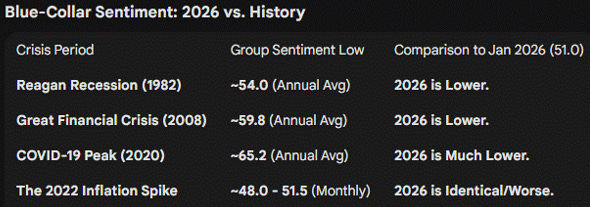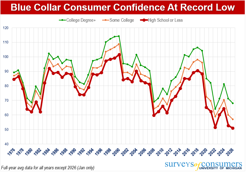 The January 2026 University of Michigan's Index of Consumer Sentiment found record-low confidence among those lacking a college degree.